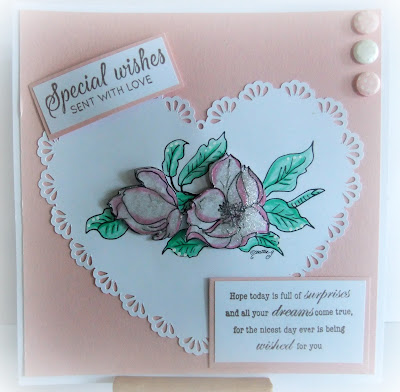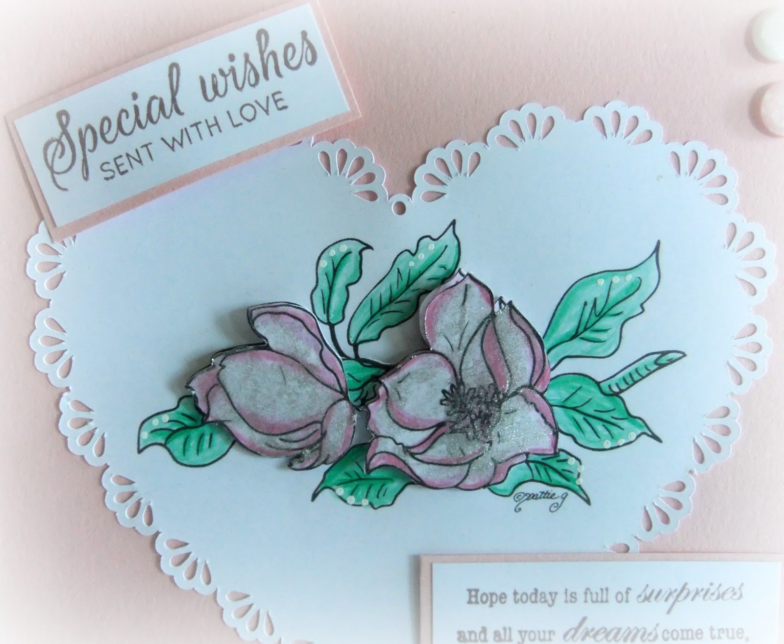 Scatty Jan This week I got to colour this beautiful Magnolia branch.You can find the image in the store right here. I love Magnolia. I printed it up 3 times and fussy cut it and layered it up to get some depth adding some sparkly glitter to the last layer.