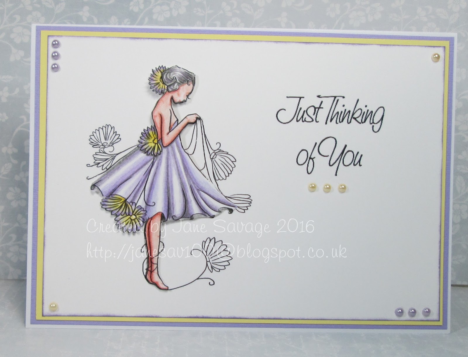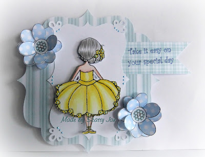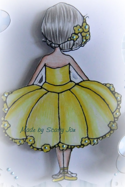 Scatty Jan....Wow such a lovely image to colour up this week - Little Dance Two from our great sponsor you can find her in the store right here . For my more than one I doubled up the image and attached top one with foam pads, I also used two flowers and lots of liquid pearls (34 tiny pearls). Those lush papers and flowers are from The Winston Collection, a perfect match for many cards and projects.